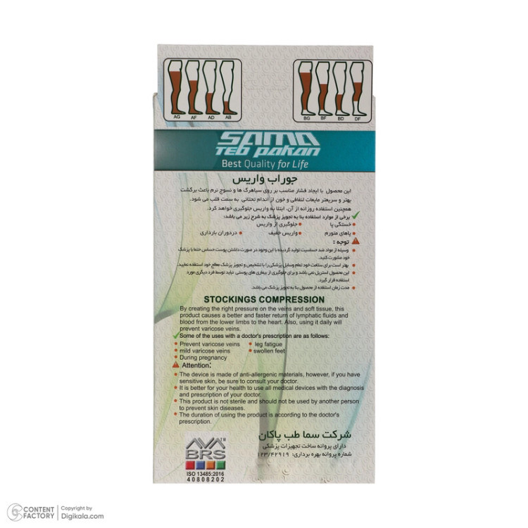 جوراب واریس بدون کفی زیر زانو سما طب از مچ پا تا زیر زانو را پوشش میدهد و با ایجاد فشاری مناسب بر روی رگهای متورم شده و نسوج پا در آن ناحیه، سبب میگردد تا خون و مایعات لنفاوی تجمع یافته در ساق پا با سهولت بیشتری به سمت قلب جریان پیدا کنند و در نتیجه علائم بیماری هر چه سریعتر برطرف گردد.